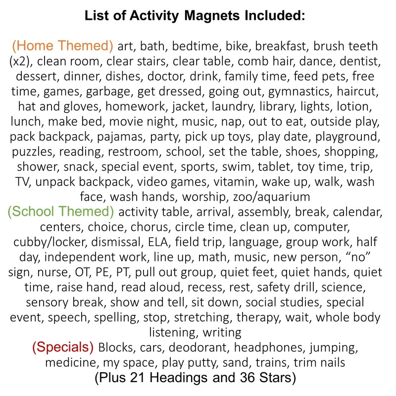 - INCLUDES: SchKIDules Deluxe Bundle includes an 18” tri-folding reversible board, 21 headings, 36 stars, 72 home themed magnets, 30 school themed magnets and 30 special needs themed magnets for the easy setup of an instant visual schedule.