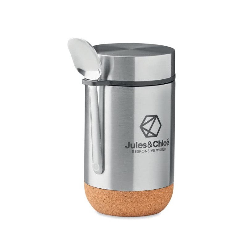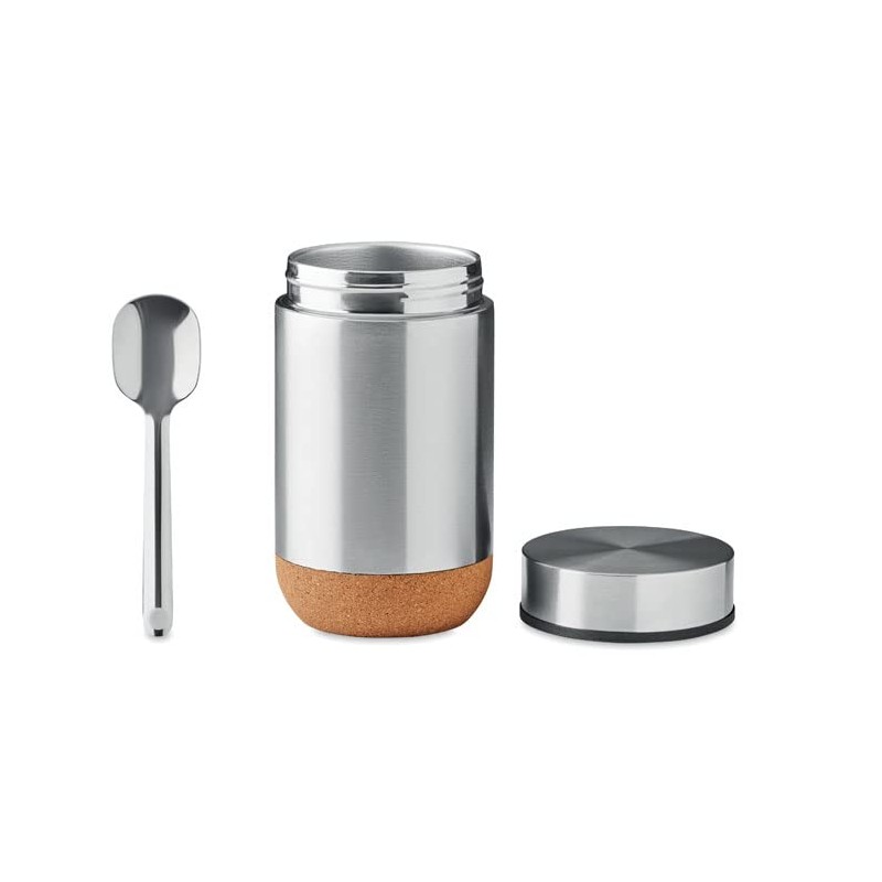 Double-walled stainless steel storage container with screw top and cork base. Includes spoon Capacity: 400 ml.