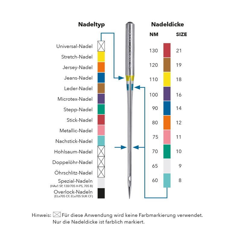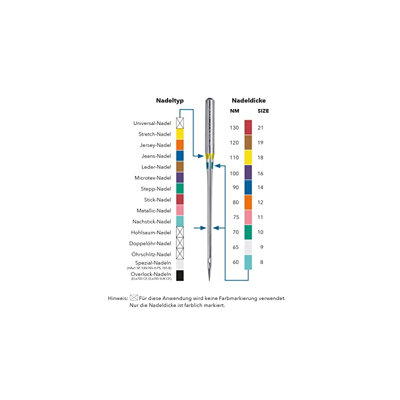 • Colour coding by SCHMETZ: needle clearly visible even without packaging. Top color mark on stretch needle = yellow, bottom color coding indicates needle thickness, universal needle only has color coding for needle thickness.