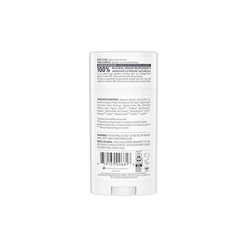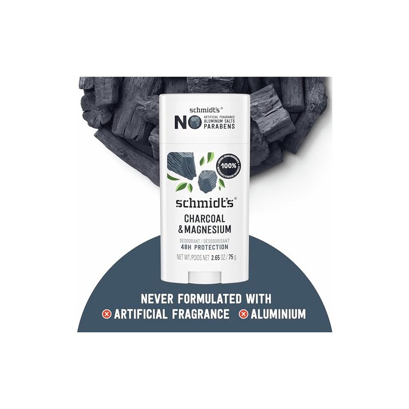Really Works. Schmidt's Charcoal & Magnesium Formulated with certified 100% natural origin ingredients, this deodorant for women and men is made without aluminum. It's also certified vegan by Vegan Action and cruelty-free by Leaping Bunny. Our women's and men's deodorants are naturally enriched with magnesium to help neutralize odor and keep you fresh with 24-hour odor protection that's gentle on skin. Schmidt's offers some of the best smelling deodorants for men and women and is made with plant-based oils and butters like coconut oil, jojoba seed oil, and shea moisture butter, as well as vitamin E. Luxurious, long-lasting scents made with 100% natural origin fragrance are never synthetic, always made with plant isolates and essential oils like tea tree oil, jasmine oil, and lavender oil. All our Schmidt's vegan deodorant sticks require only a small amount for overall effectiveness. To use, hold the deodorant briefly to skin to soften on contact with your body heat. Gently apply 1C2 swipes to dry, clean underarms to keep you feeling fresh all day. This aluminum free deodorant for men and women uses a non-greasy/non-sticky formula that is easily absorbed. Do not apply to irritated, damaged, or freshly shaved skin.