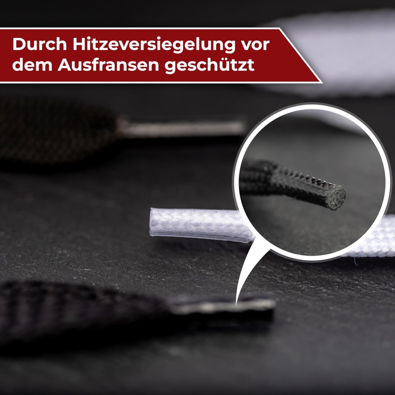 Discover the high-quality flat laces from Schnürfuchs - perfect for any shoe and any occasion. Available in classic black or white, these versatile laces are made from durable cotton that ensures both durability and comfort. With a length of 120 cm and a width of 8 mm, they fit perfectly into most shoes and offer a secure, comfortable fit. The laces made in Spain are suitable for all genders and impress with their high-quality workmanship. Whether for trainers, work shoes or elegant shoes, these laces from Schnürfuchs are the ideal choice for people who value quality and timeless design. The flat shape allows for even lacing and prevents unwanted twisting of the laces.