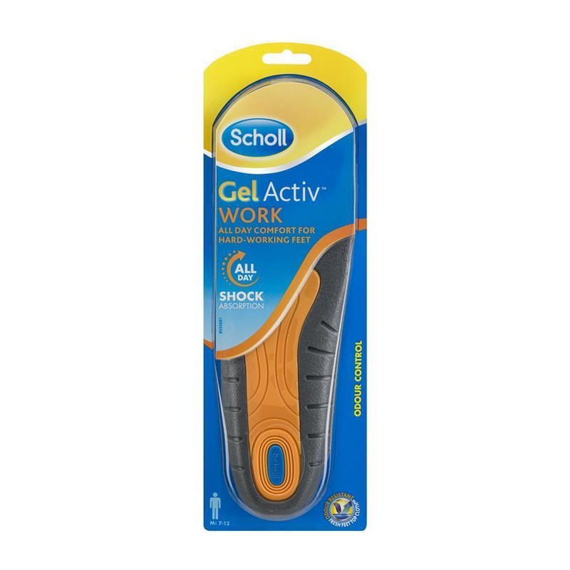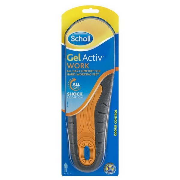 Scholl Gel Activ Work Insoles Men provides all-day superior (vs. no insole) cushioning and shock absorption performance. All day comfort for hard-working feet.