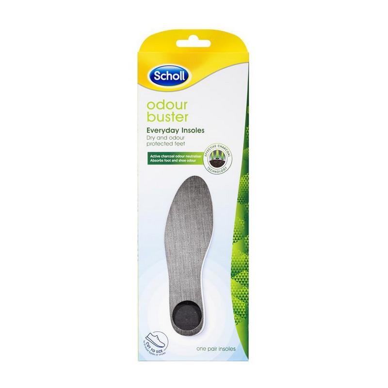 Scholl Odour Buster Everyday Insoles absorb perspiration to keep feet dry and the Active Charcoal Odour Neutraliser absorbs foot and shoe odour