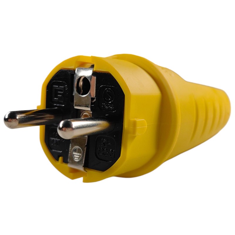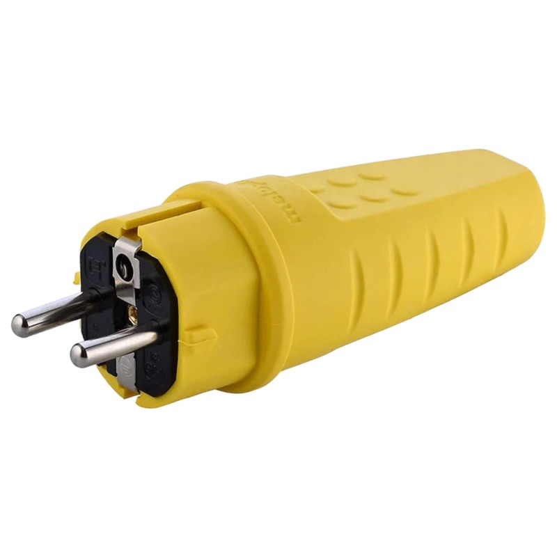 - Schuko plug 230 V and non-slip rubber handle in yellow. Perfect for connecting to extension cables or repairing power cables; suitable for cable cross sections up to 2.5 mm² - waterproof power plug and shatterproof Schuko plug. Schuko plug is robust and waterproof (IP44) for outdoor use, made of rubber, 230 V, 16 A, for cables up to 2.5 mm² diameter.