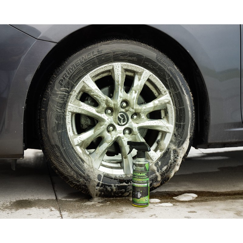 - FOUR EASY STEPS: Prerinse the tire & rim to cool the surface. Spray Atomic Tire & Rim Cleaner generously on the tire & rim. Agitate the product on the tire & rim using a brush or wash mitt. Power wash thoroughly to remove all excess product from the tire, rim, and wheel well.