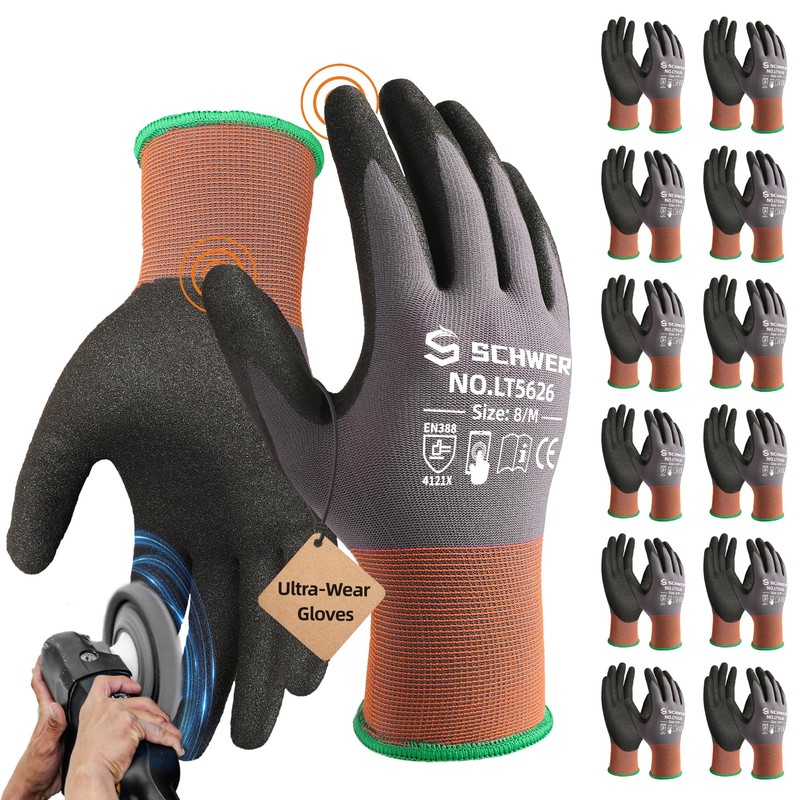 Schwer 12 Pairs Lite Sandy Nitrile Coated Work Gloves LT5626, Working Gloves with Grip Touchscreen Compatible for General Purpose Automotive Electronic Assembly, Gray,M