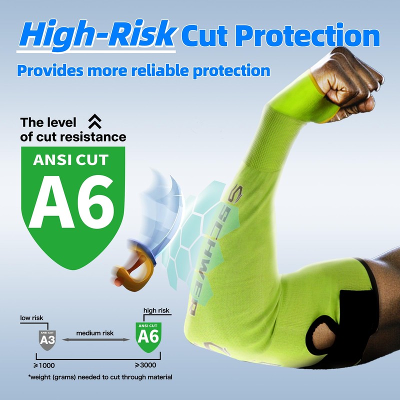 - High-Risk Cut Protection - Our A6 cut-resistant sleeves offer superior protection, withstanding over 3000 grams of cutting loadmore than 3 times the strength of common A3 sleeves. These sleeves are specifically designed for high-risk situations, ensuring robust defense against severe cut hazards