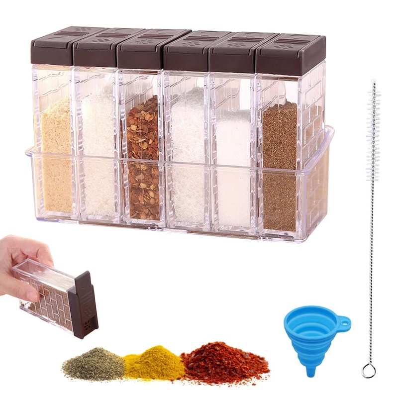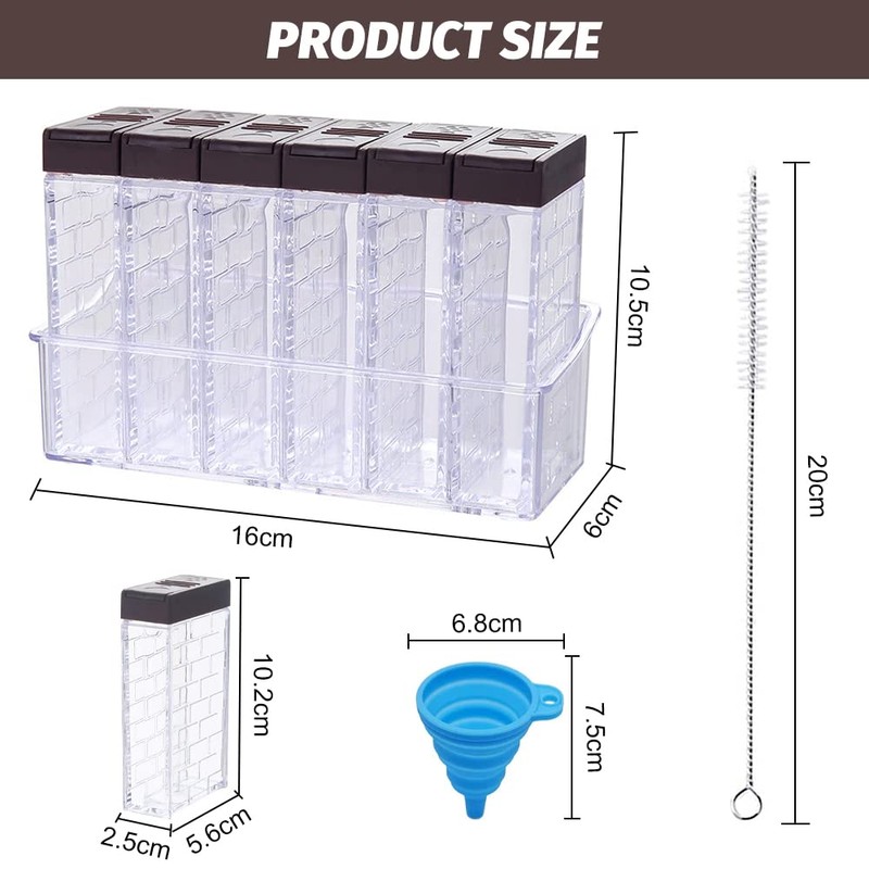 The package contains 1 six-piece plastic spice shaker, 1 brush and 1 silicone funnel. The funnel can help you fill the spice jar, and the brush can help you clean the spice jar and extend the service life of your spice jar.