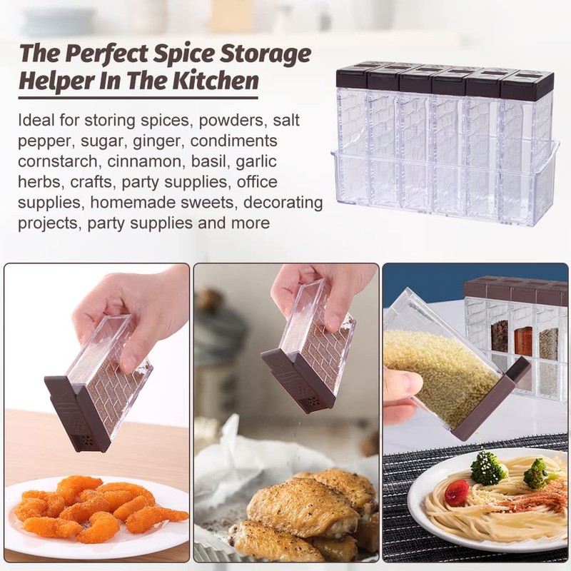 The package contains 6 plastic spice shakers, each of which is an independent storage place, and each spice can be stored independently, so that your spices do not smell and the shelf life of the spices is extended.