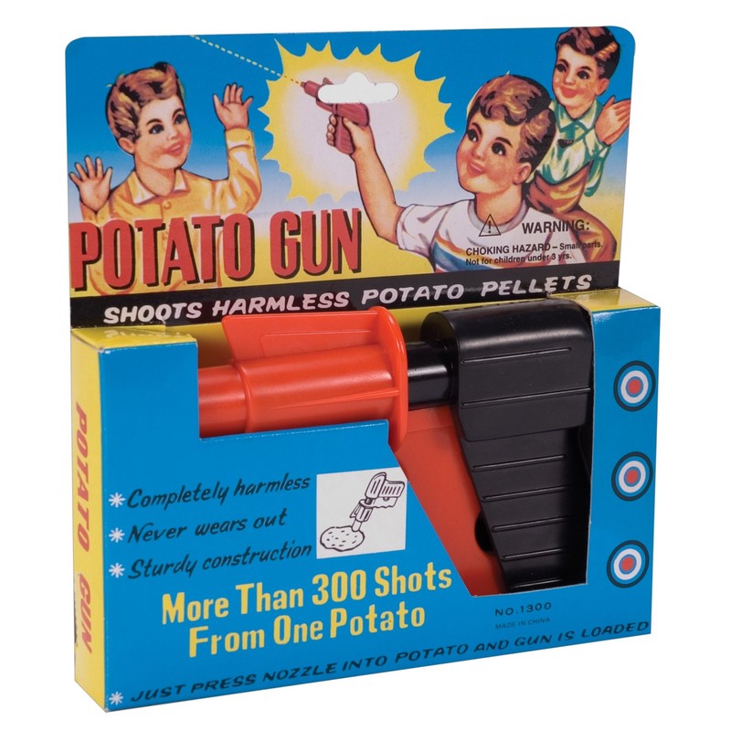 • A quick pull on the trigger and it shoots out a harmless potato pellet