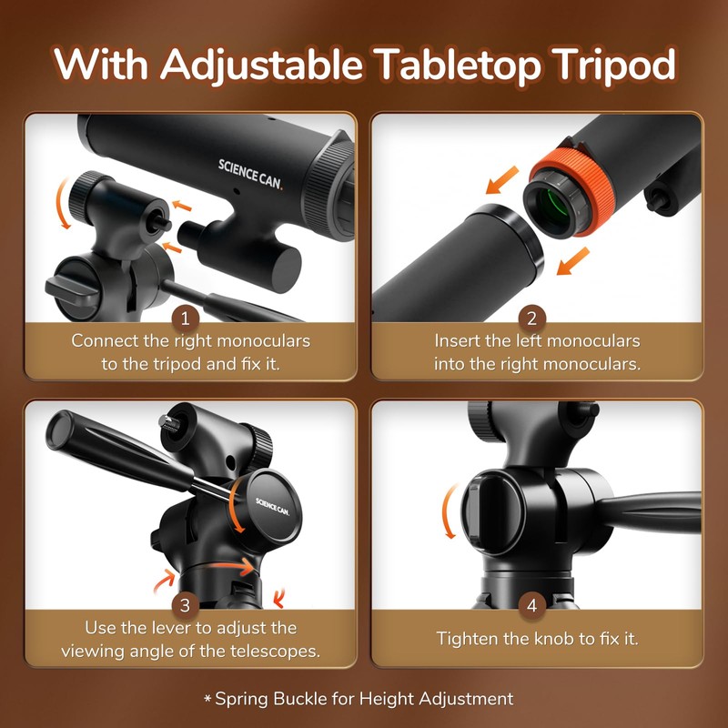 - 3-in-one telescope: Astronomical telescope with 4x magnification, which satisfies children's curiosity to explore nature. It can also be converted into two single tubes for easy sharing with friends. The connectable tripod transforms binoculars into 16x stereoscopic telescopes and allows children to observe and understand the fascinating changes of the moon