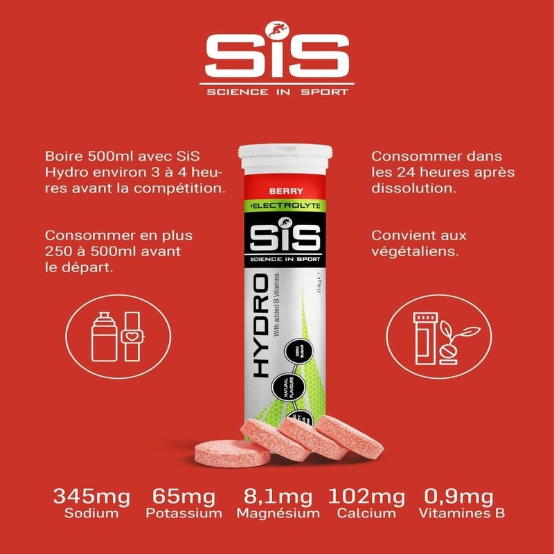 Science In Sport Hydro vegan hydration tablets, berry flavour plus electrolytes, contain just the right amount of scientifically researched clinical doses of all your body's essential electrolytes to ensure you can go further for longer by dramatically reducing fatigue from electrolyte imbalances. Hydro meets your sodium requirement at a specific concentration (30 mmol/Litre) that is scientifically proven to produce superior hydration compared to water alone. Suitable for vegans and vegetarians, these hydration tablets are high in B vitamins and gluten-free. They have natural flavours, zero sugar and are ideal for any athlete, gym-goer, or health-conscious person. Simply drop a tablet into water for effective hydration, with virtually no calories, before and during sports. Drop in 500ml water, let it dissolve, then drink.