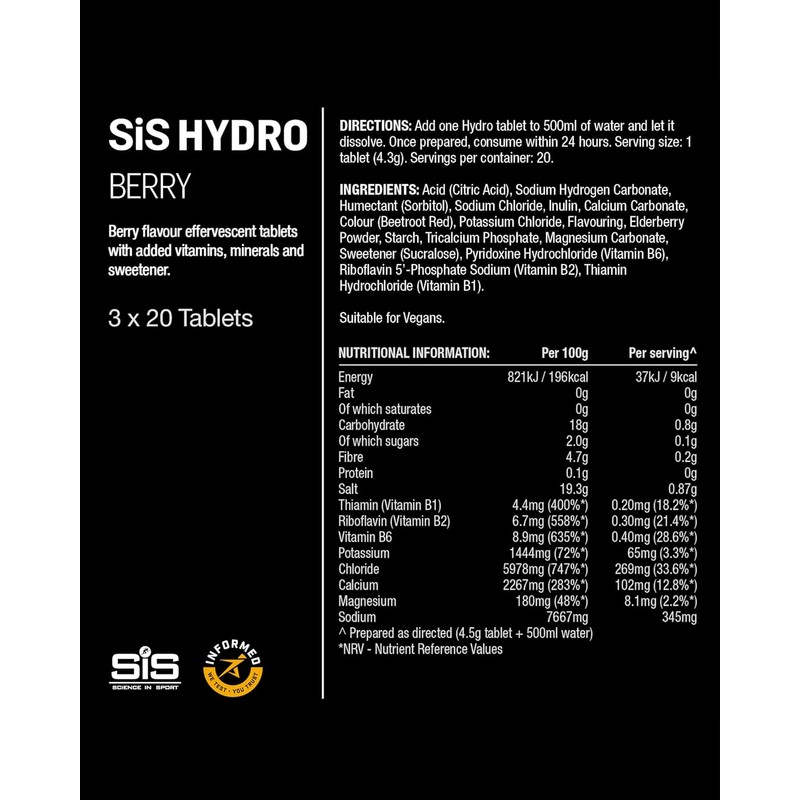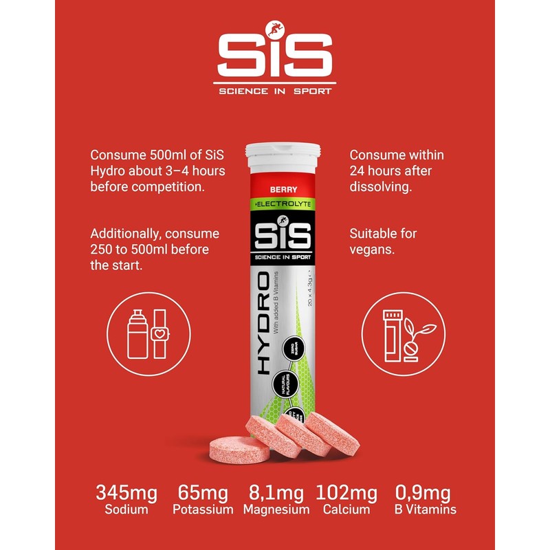 Science In Sport Hydro vegan hydration tablets, berry flavour plus electrolytes, contain just the right amount of scientifically researched clinical doses of all your body's essential electrolytes to ensure you can go further for longer by dramatically reducing fatigue from electrolyte imbalances. Hydro meets your sodium requirement at a specific concentration (30 mmol/Litre) that is scientifically proven to produce superior hydration compared to water alone. Suitable for vegans and vegetarians, these hydration tablets are high in B vitamins and gluten-free. They have natural flavours, zero sugar and are ideal for any athlete, gym-goer, or health-conscious person. Simply drop a tablet into water for effective hydration, with virtually no calories, before and during sports. Drop in 500ml water, let it dissolve, then drink.