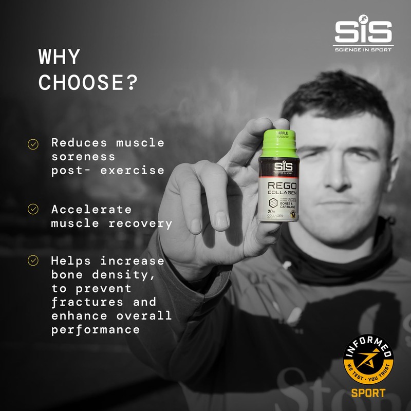 Product DescriptionKeep pushing your limits with SiS REGO Collagen Shot C a powerful 20g dose of bovine collagen designed to support joint, tendon, ligament, and muscle health. Whether you're an endurance athlete, weightlifter, or fitness enthusiast, collagen is a key component for strength, recovery, and injury prevention.Collagen is a naturally occurring protein that plays a crucial role in maintaining soft tissue health. However, as we age or put our bodies through intense training, collagen production declines, leading to increased joint stress and slower recovery. That's where SiS REGO Collagen Shot comes in.Each serving delivers: 20g Bovine Collagen C a superior, bioavailable source that supports connective tissue strength. 80mg Vitamin C C enhances collagen synthesis and absorption, ensuring maximum effectiveness.Why Choose Bovine Collagen Over Marine Collagen?Bovine collagen is rich in Type I and Type III collagen, the most abundant forms in muscles, bones, tendons, and ligaments. Unlike marine collagen, it provides broader benefits for athletes needing full-body support, from joint mobility to muscle recovery.How to Use: Take one shot 60 minutes before or immediately after exercise. For enhanced recovery or injury prevention, consume an additional shot daily during intense training periods.IngredientsINGREDIENTS: Water, Collagen (Bovine) Hydrolysate, Acidity Regulators (Malic Acid, Citric Acid, Phosphoric Acid), Natural Apple Flavouring with Other Natural Flavourings, Vitamin C, Preservative (Potassium Sorbate), Sweeteners (Sucralose, Steviol Glycosides from Stevia)DirectionsConsume 1 shot 60 minutes before or immediately after exercise. Consume an additional shot daily during periods of injury.Safety WarningFood supplements should not be used a substitute for a varied, balanced diet. Not suitable for pregnant or breastfeeding women. Store in a cool, dry place away from direct sunlight. Shake before use. Not suitable for vegetarians.Manufacturer Contact InformationSiS Group PLC 8A Frontier Park, Frontier Avenue Blackburn BB1 3AL
