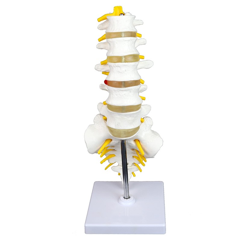 This replica of the lumbar spinal column consists of the 5 lumbar vertebrae, sacrum and coccyx. The inter-vertebral discs, spinal cord and lumbar nerves are also shown, as well as a prolapsed disc between the L3 and L4 vertebrae. Comes mounted on a stand.