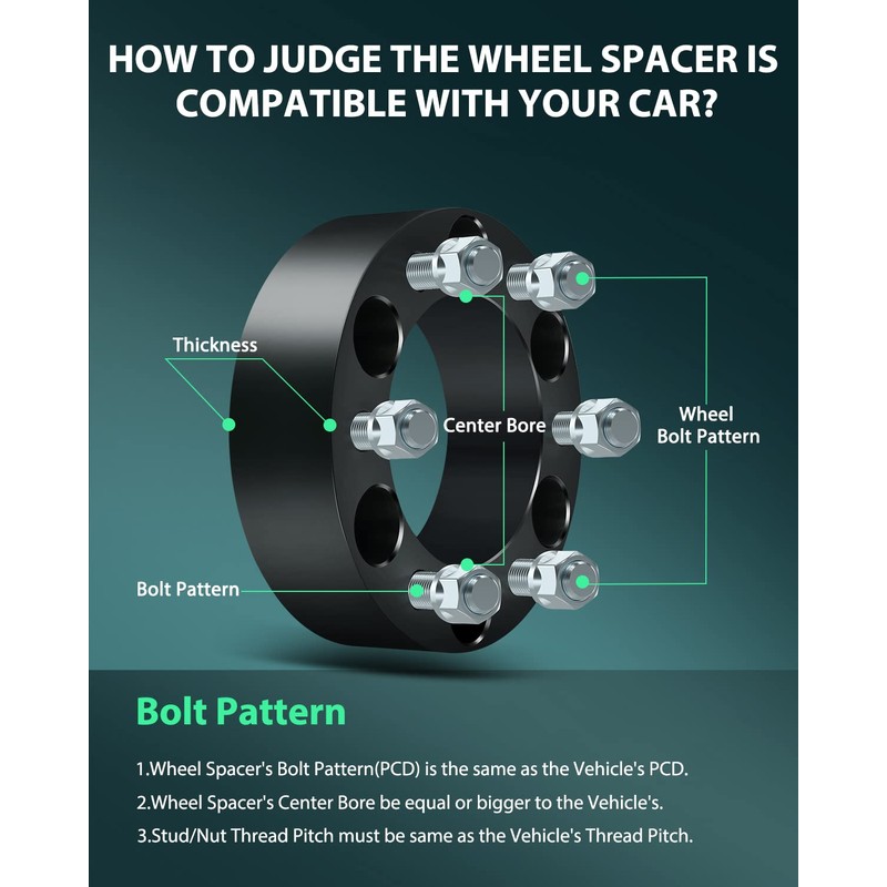 - 6 Lug 1.5" Wheel Spacers Kits: Spacers Specifications; Thickness: 1.5 inch; Vehicle Bolt Pattern: 6x135; Wheel Bolt Pattern: 6x135; Thread Pitch: 14x2; Center bore: 87.1mm. Package contains: 2Pcs Black No Hubcentric Wheel Spacers .Please recheck your vehicle compatibility (year/make/model) in the product description before purchasing the wheel spacers