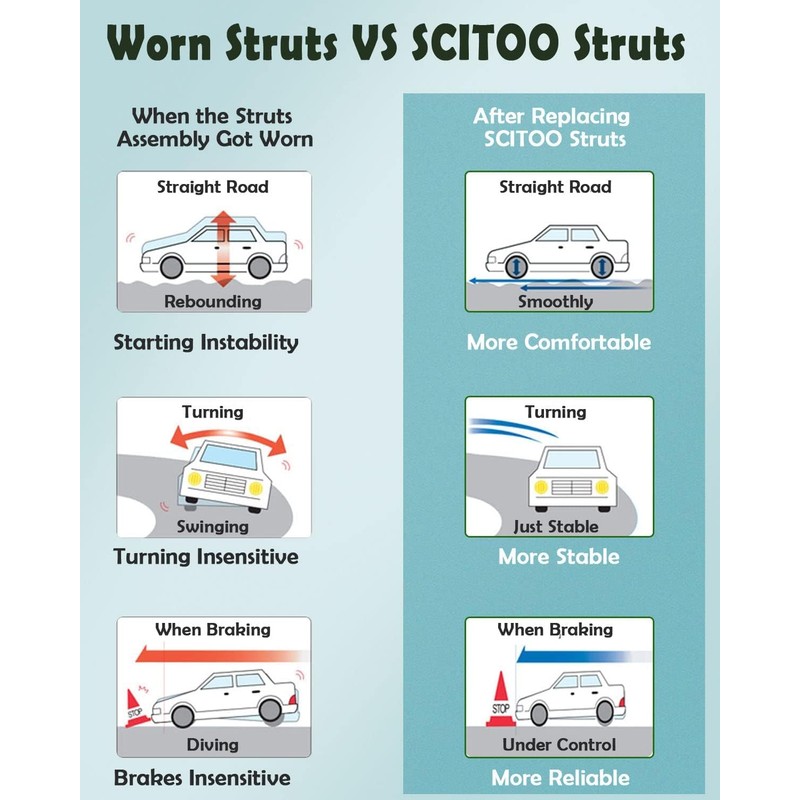 • 【Note】SCITOO Auto supply for most cars,SUVs,trucks and with Struts Complete Assembly.Please select your vehicle (year/make/model/trim) in the top left corner of the page to confirm compatibility or refer to the vehicle information in the description