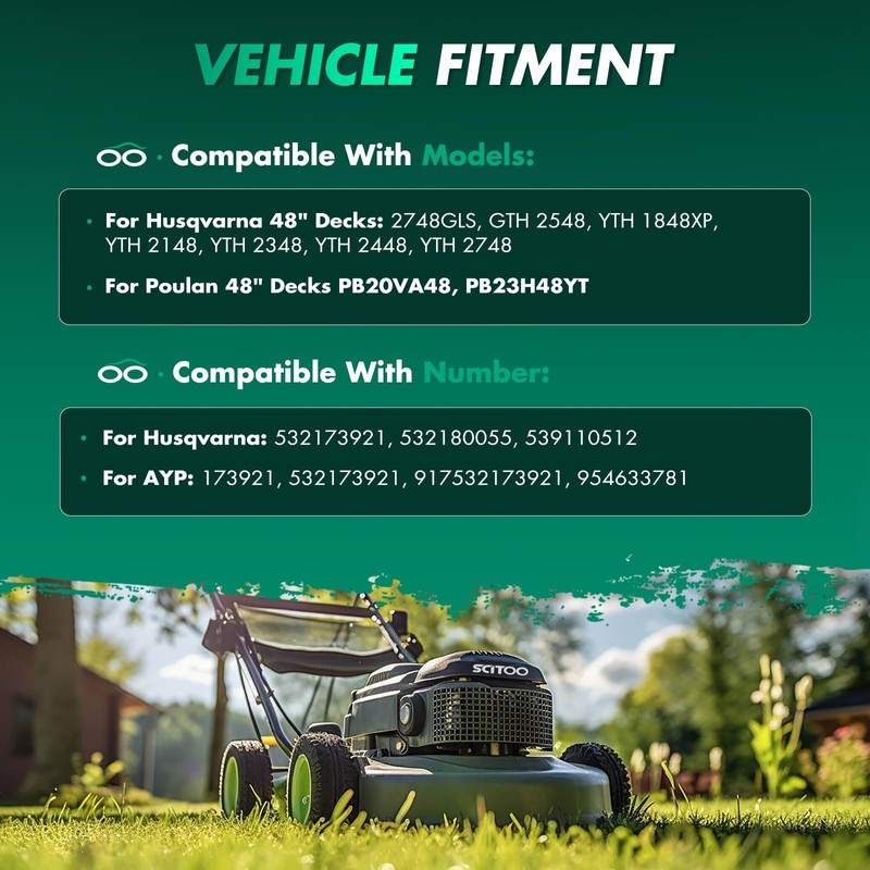 - Suitable for Models: for Husqvarna 48" Decks 2748GLS, GTH 2548, YTH 1848XP, YTH 2148, YTH 2348, YTH 2448, YTH 2748 ; for Poulan 48" Decks PB20VA48, PB23H48YT;