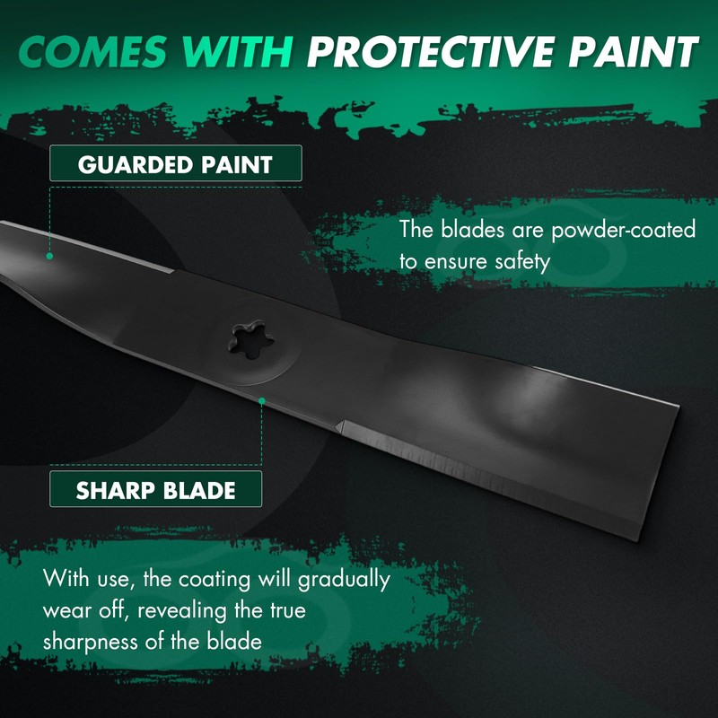 - Function: The blade is very suitable for cutting overgrown weeds or clearing rugged terrain. You can sharpen the blade if you want to maintain a neat, even cut for normal lawns. The cutting edges are painted to prevent rust and protect your hands during installation. The paint will wear off as you mow the grass.