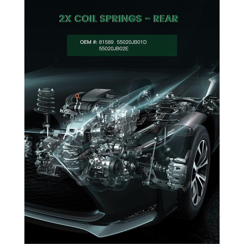 - KIT INCLUDES: 2x Rear Coil Springs (Left and Right) - 81589, 55020JB01D, 55020JB02E