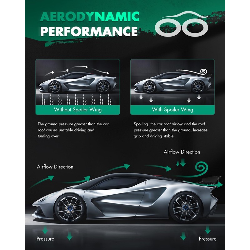 • Function: When the car is driving at high speed, the Spoilers Wings effectively controls the airflow down pressure, so that the drag coefficient is correspondingly reduced, and the air resistance of the car is reduced. Therefore, the addition of the Spoilers Wings is also helpful to save fuel.