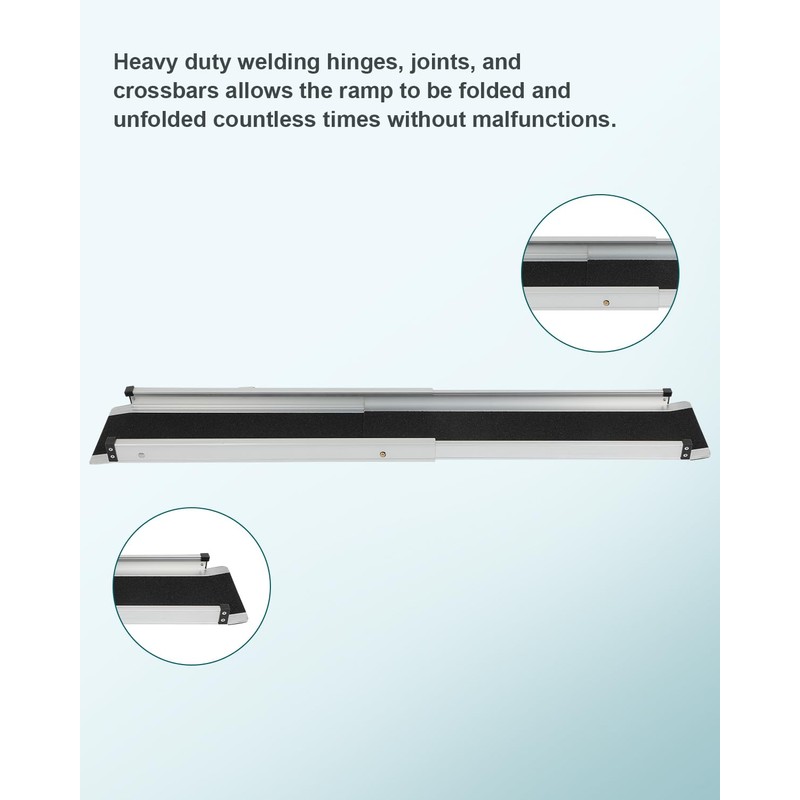 - ANTI-SLIP MOBILITY RAMP: The door ramp surface is pasted with anti-slip film which is with high traction and anti-skid ability. Non-slip rubber pads placed on the back at the top of the wheelchair ramp for safety use and avoid slip from the using occasions. All locks in the wheelchair ramp are made of stainless steel. The bending degree of the locks in the ramp can be adjusted by using tools.