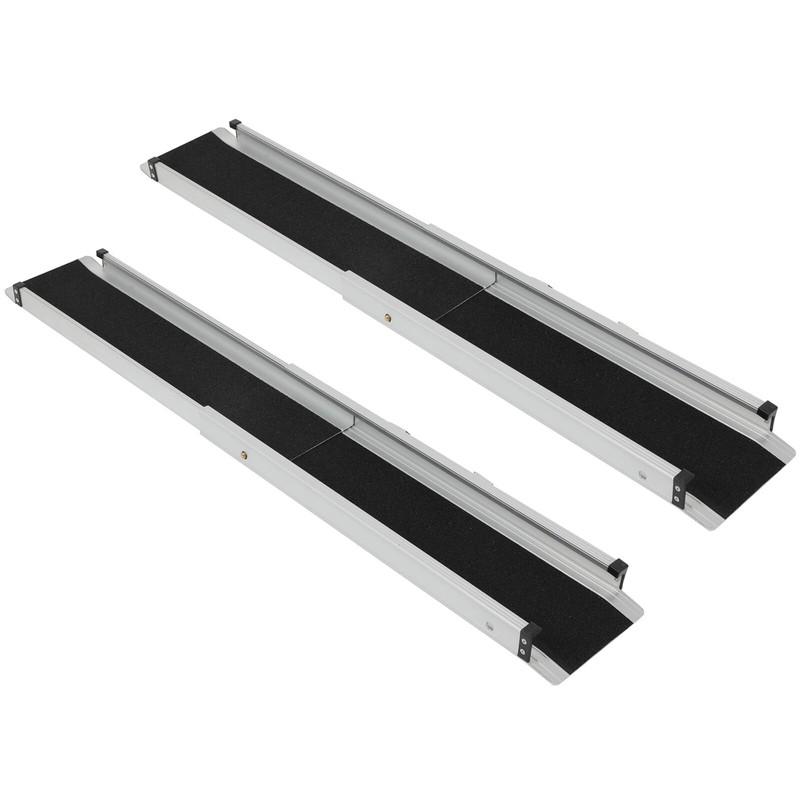 - PORTABLE WHEELCHAIR RAMP: Portable threshold for wheelchair is sold in pair, wheelchair ramps are 5' (153cm) long, 8.3" (21cm) outer wide, 6.7" (17cm) use wide, the ramps can be used on a step from 6"-15" (15-37.5cm). Best recommended using height is 10" (25cm). Suitable for vehicles with wheels section width less than 5.7" (145mm), ground clearance higher than 2" (5cm).