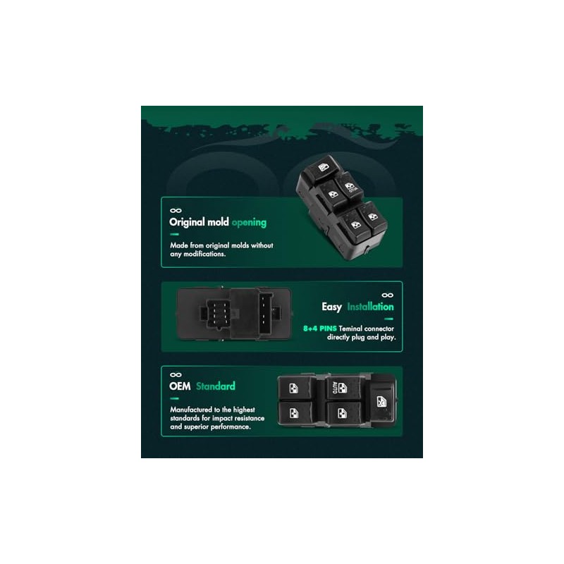• Specifications:  Location:Front Left;  Housing Material:Plastic;  Color:Black;  Terminal Quantity:8+4;  Switch Type: Driver Side Power Master Window Switch