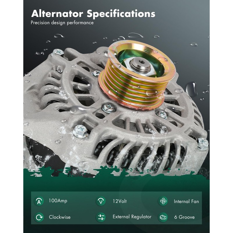 - Alternators Specifications- Voltage: 12V; Amperage: 100A; Rotation: CW(Clockwise); Regulator: ER ; Fan: IF; Grooves: 6 Groove Pulley, high output alternator is compact and lightweight, fully compatible with the electronic system of your vehicle