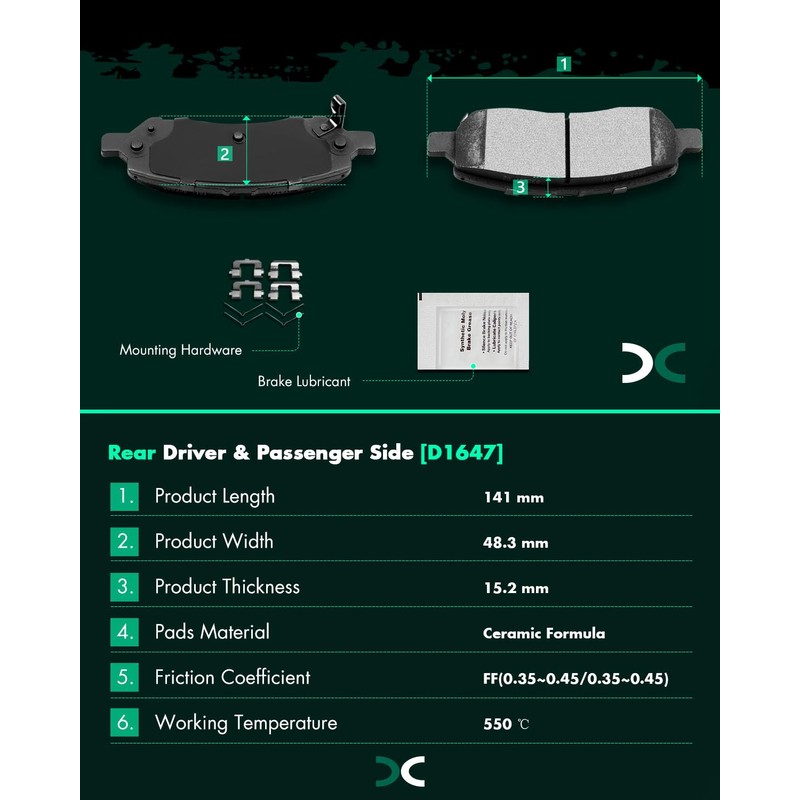 - Specification 2---- D1647-8875 Rear Pads -- Thickness of Friction Material: 15.2 mm;Friction coefficient: FF(0.35~0.45/0.35~0.45);Tolerant Temperature: 550;Brake Pads Thickness: 40.6mm;Product length: 141mm;Product width: 48.3mm; Material: Ceramic