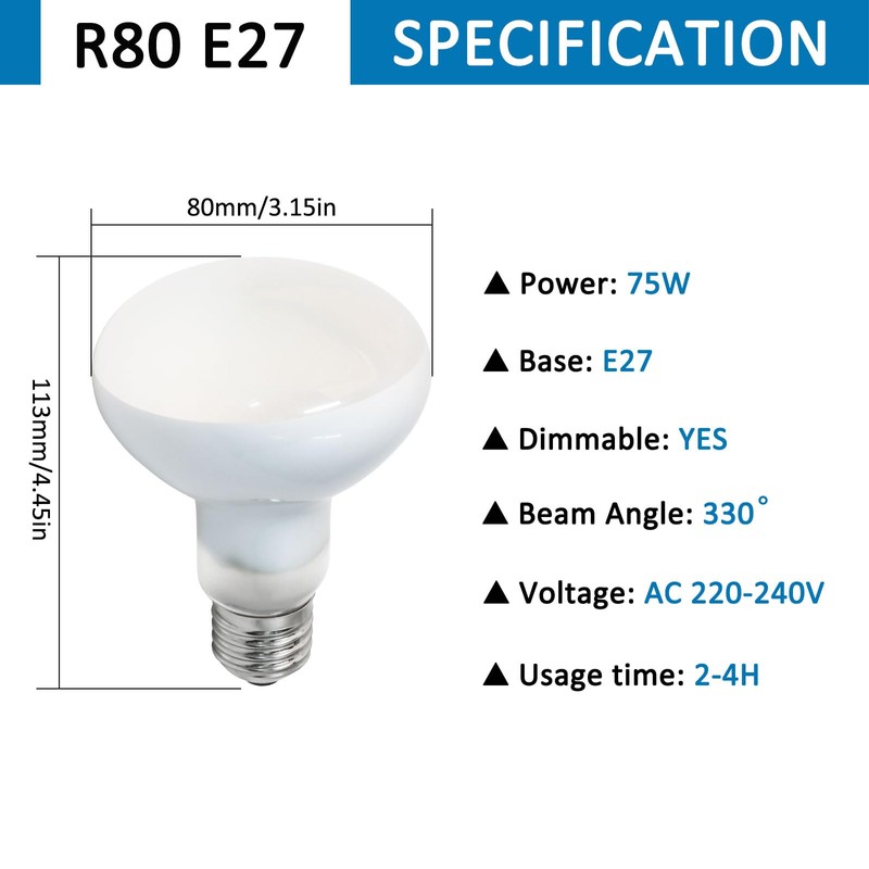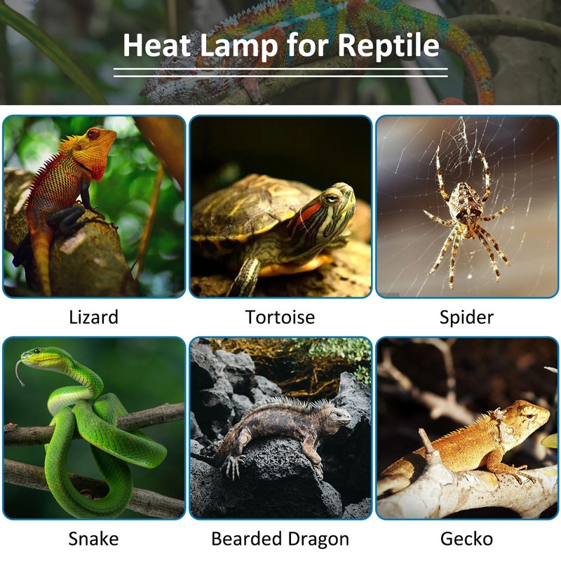 - Application: reptile heat lamp E27 is suitable for a variety of reptiles and amphibians, such as bearded dragons, geckos, chameleons, snakes, turtles, tortoises, iguanas, lizards, frogs, spiders, birds, small mammals, etc.