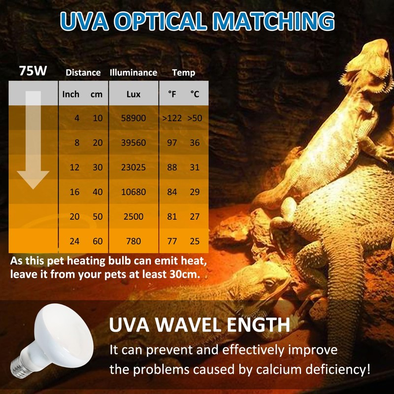 - UVA heat lamp: reptile heat lamps ensure strong penetration and a suitable temperature. Ultraviolet rays stimulate appetite, promote natural behavior, facilitate the activity, digestion and reproduction of reptiles and promote healthy growth and development of pets.