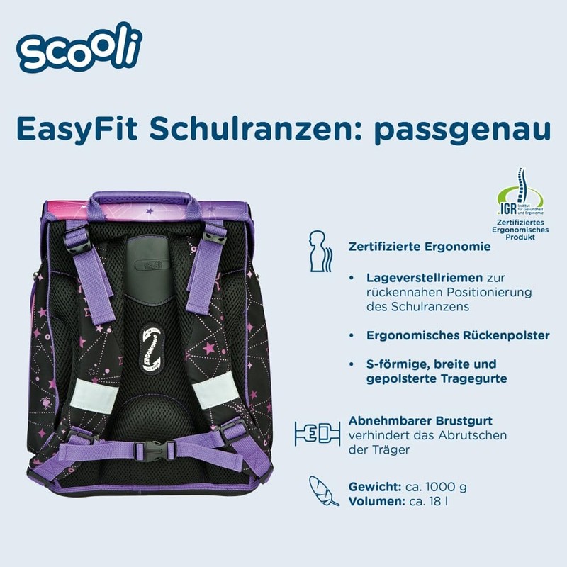 - With this Scooli item, your child can go to school carefree. The reflective surfaces on the Scooli school bag ensure a lot of safety. In addition, the ergonomic carrying system inspires. Dimensions: 28 x 36.5 x 23 cm