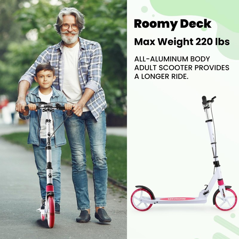 Scooter for Ages 8+ Teens and Adults Kick Scooter Foldable with Double Braking System Bells Adjustable Handlebars Kickstand Max Load 220 LBS 8" Big Wheels (White)