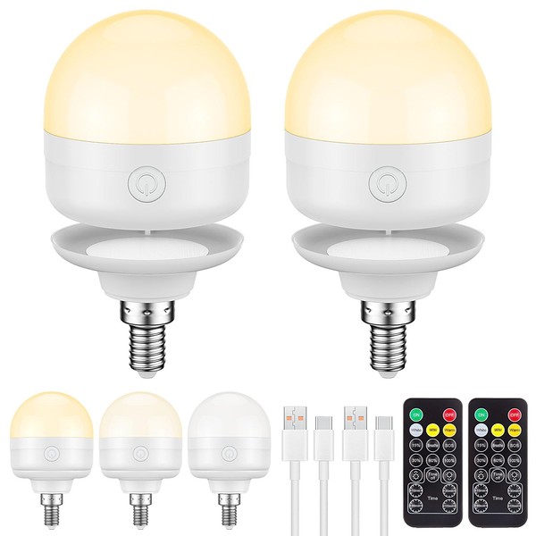 SCOPOW E12 2Packs Rechargeable Light Bulbs with Remote Control Timer and 3 Color Temperature Magnetically Battery Operated Light Bulbs Dimmer for Non-Hardwired Detachable (5W+E12+3Colors+2PC)
