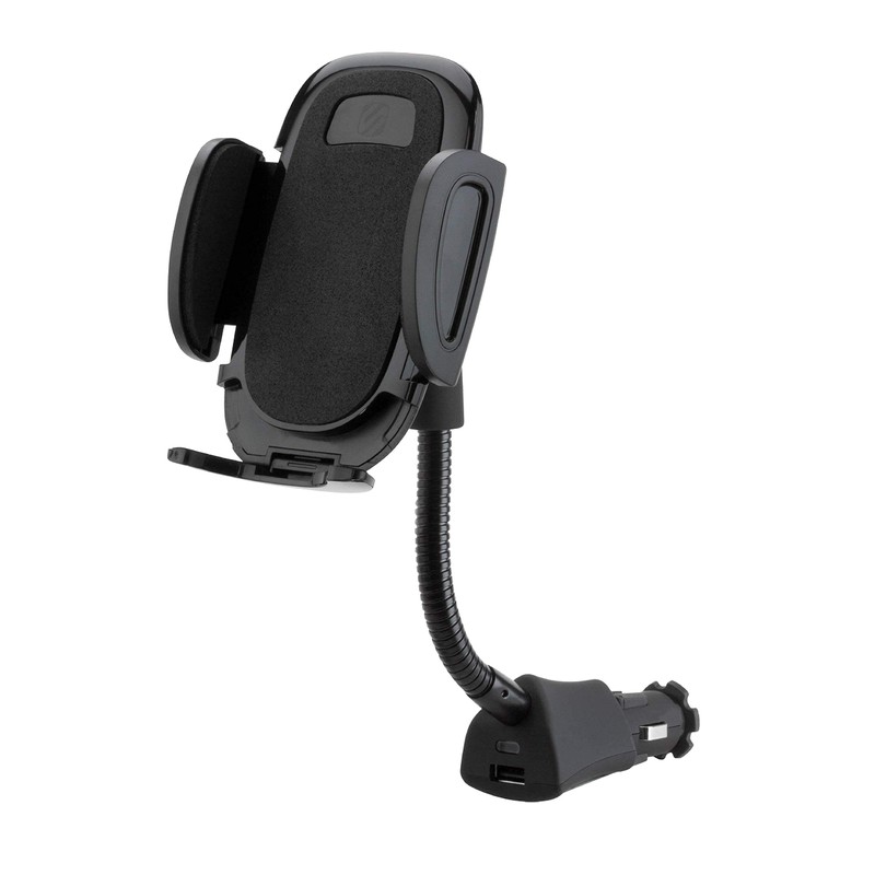 Scosche Universal 12V Car Phone Mount with USB Charger, Phone Holder with Cigarette Lighter Adapter for 12V Socket Plug-In, Flexible Gooseneck, Adjustable Cradle for iPhone & Android Cell Phones
