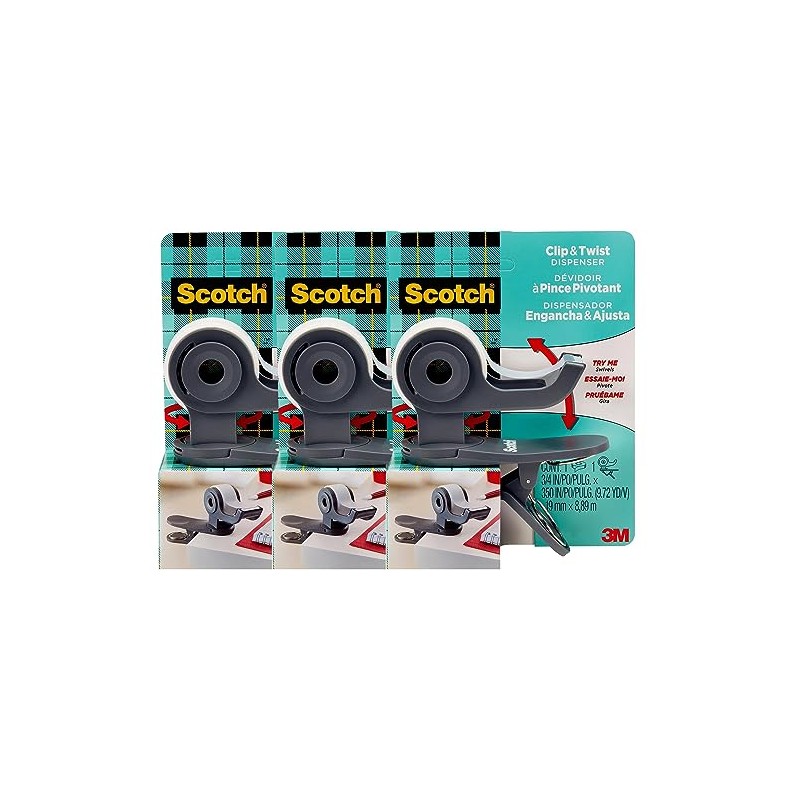 Scotch Brand Clip & Twist Tape Dispenser, Great for Gift Wrapping, Clips to Desks, Tables, Easy Charcoal Gray, 3-Pack (C19-3PK-SIOC)