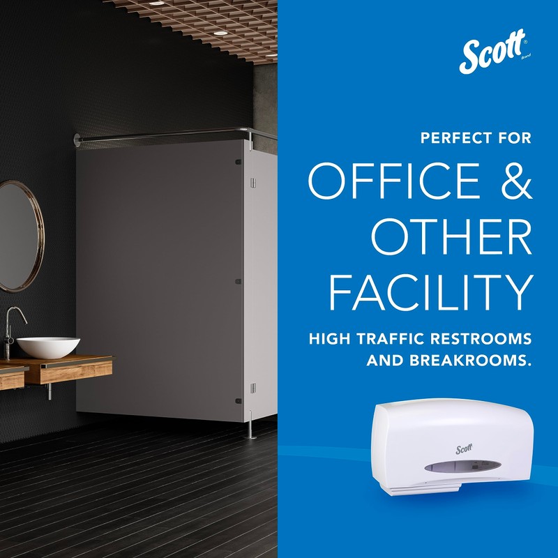 - 1 Scott Essential Coreless Double Jumbo Roll Toilet Paper Dispenser, White, Dispenser dimensions: 2" x 6" x 11"