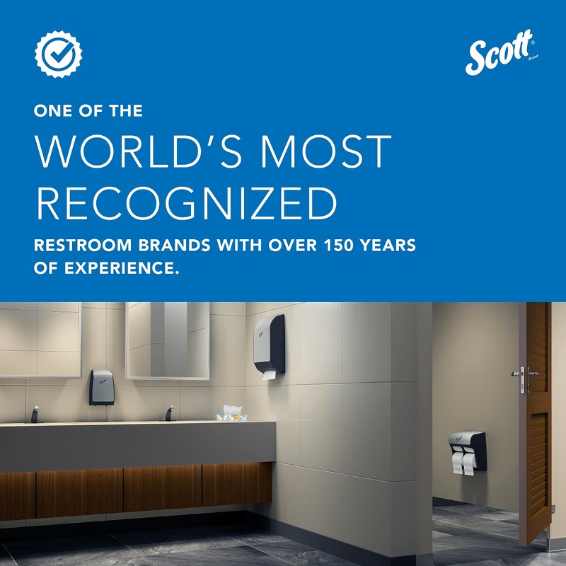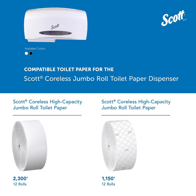 - Designed to dispense two 9.38" diameter x 3.8" wide coreless tissue rolls (look for compatible rolls from Kleenex and Scott Brands)