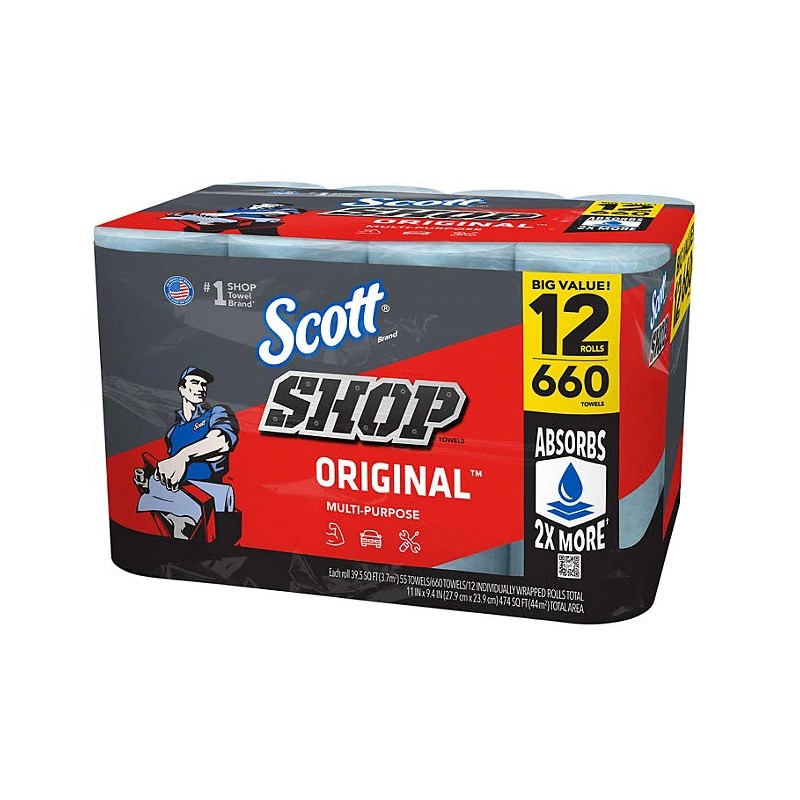 Scott shop paper towels are specifically engineered for softness, strength and high absorbency, which makes them suitable for cleaning grease, motor oil and other liquids.