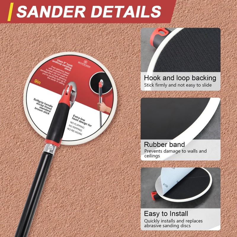 - 【High Efficiency】SCOTTCHEN 9in round radius drywall sander is larger than traditional sanding blocks, up to 3 times faster than a conventional sanding pole, with better results. Scrape off any of the loose bits of plaster without the need to go back over with handheld sanding sponges or papers.