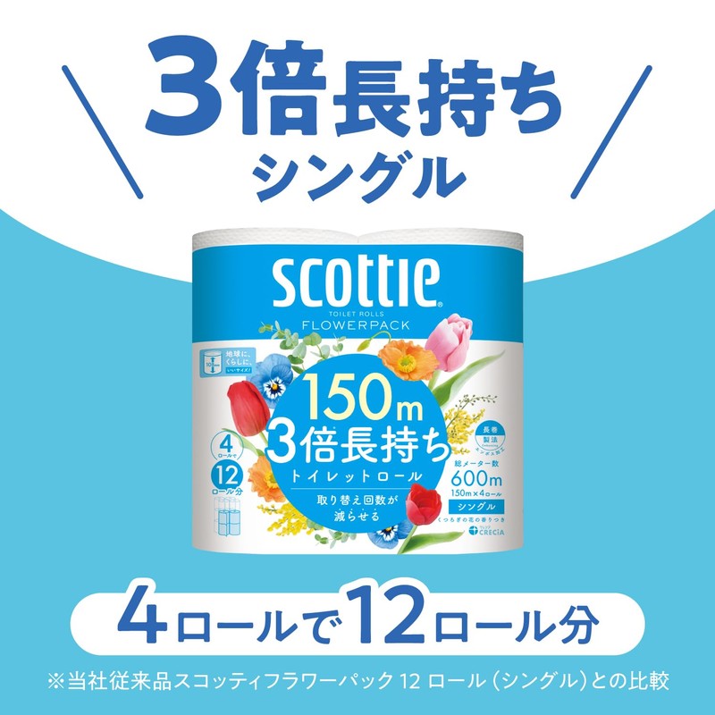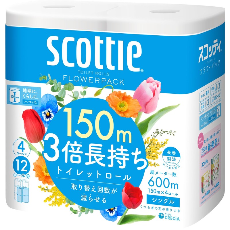 Scotty Flower Pack, 3 Times Longer, 4 Rolls of Toilet (150 m), Single