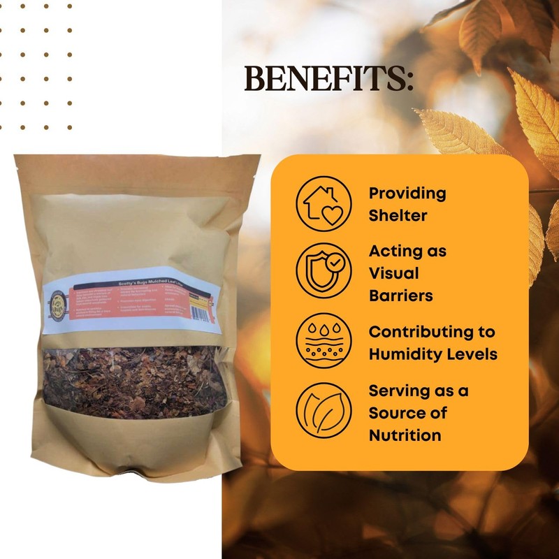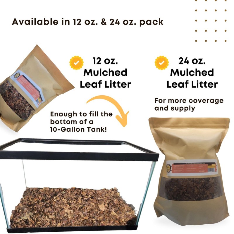 - Mulched for Maximum Benefit: Our leaf litter has been properly mulched, resulting in a substrate that fills enclosures more effectively, providing more access to burrowing, & offers easy digestion as a food source.