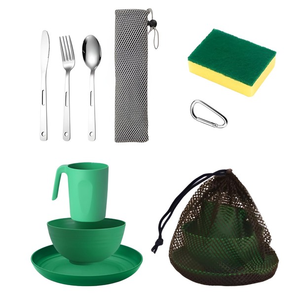 - 【Complete Scout Camping Mess Kit】The all-in-one camping mess kit includes 8 pcs essentials. 1 x 5.9'' bowl, 1 x 7.87'' dinner plate, 1 x 22oz mug, 3 x dinner cutlery set (fork, spoon, knife) with case and carabiner, 1 x food grade mesh bag, 1 x scrub sponge