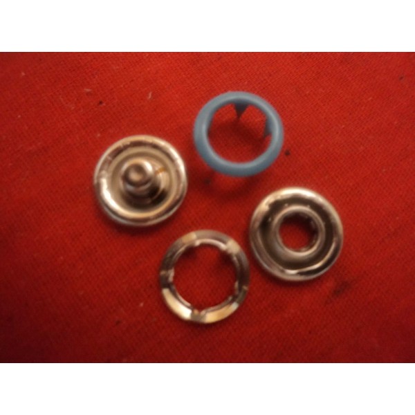 4 PART OPEN RING SNAP FASTENRS. SIZE-16. 3/8". LIGHT BLUE. 1 DOZEN COMPLETE SETS-INCLUDES 1 DOZEN OF EACH PART. 144 SETS