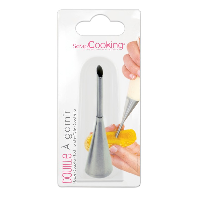 Stainless steel sleeve to garnish your cakes accurately and specifically your cream puffs, with whipped cream or your lightning. Its very thin and elongated tip allows you to do a little invisible hole in your baked goods to fill them with cream your choice. Dimensions: 0.5 x 2.4 x Ø cm H7,4 To clean a passage under hot water is enough.