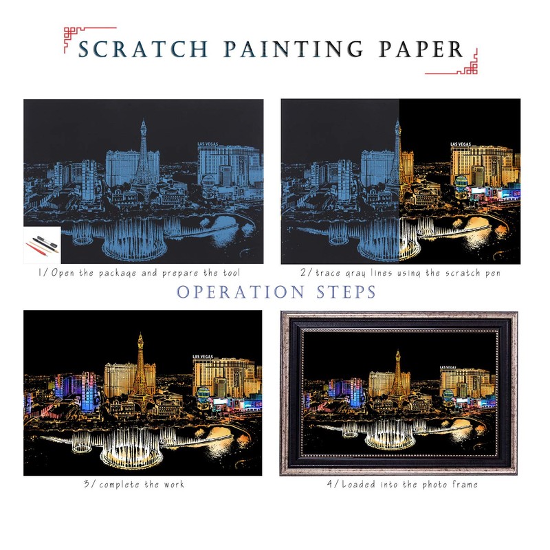 - ✔【1. Scratchboard Art Material】-Our Scratch Art Rainbow painting paper is made of coated paper, odorless and non-toxic powder, and has passed CE-ROHS certification. And it is designed according to the real city night scene pictures, with a high degree of restoration.