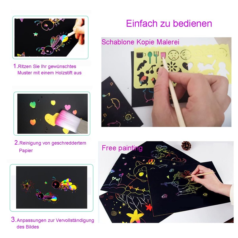 • Great fun: this scratch paper differs from conventional drawing cards by scratching with wooden pens and a colourful variation of the basic colours, which promotes children's creativity and makes designing more fun.