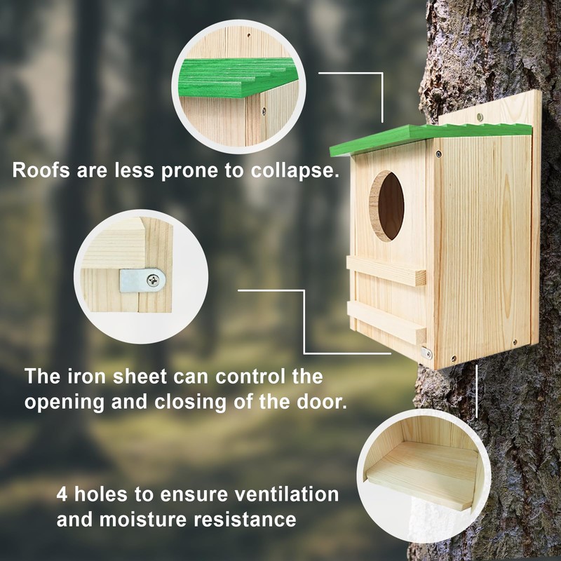 - Ventilation and Moisture Protection - Bottom board of the owl house cuts off the four corners, leaving a gap to ensure that the owl box is ventilated and protected from moisture.