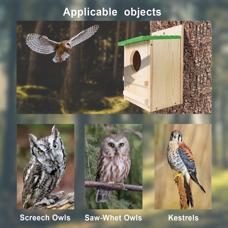 - Upgraded Safety Protection - Most of the owl house like to set up a scratching pole outside for owls to stand on, which can easily cause other animals to use the scratching pole to enter the owl nest and pose a threat to the owl hatchling. So, we improved the design by setting up a scratching pole on the wooden board at the entrance of the hole to ensure that the owls can climb and stand freely for observation, while at the same time protect the owl's home from being disturbed by other animals.